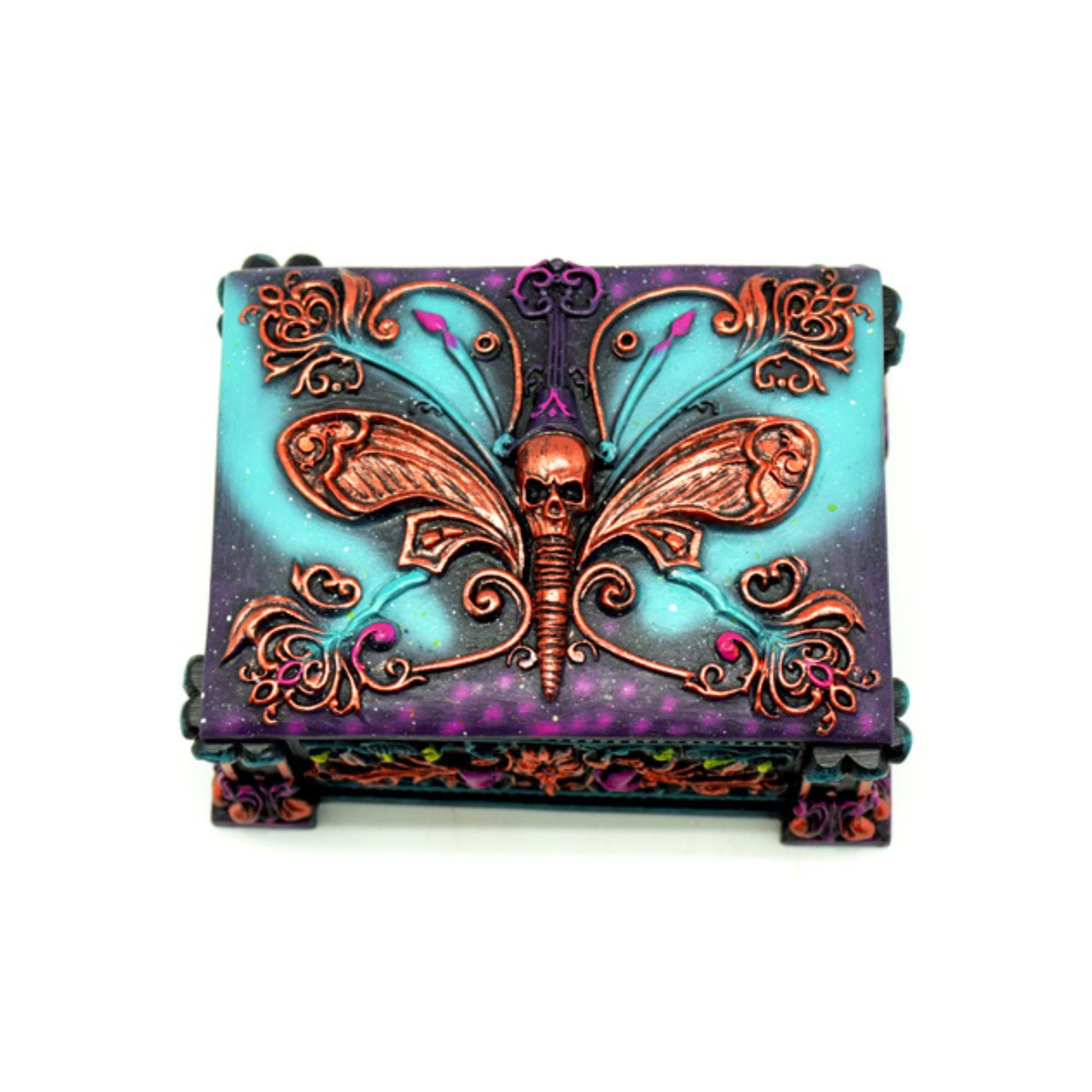 This unique box is crafted from cold cast resin, featuring a detailed skull with a moth on the lid. The moth, symbolizing transformation and mystery, with the colors in a metallic golds, warm coppers, and deep blues. Perfect for Tarot storage and small finds.