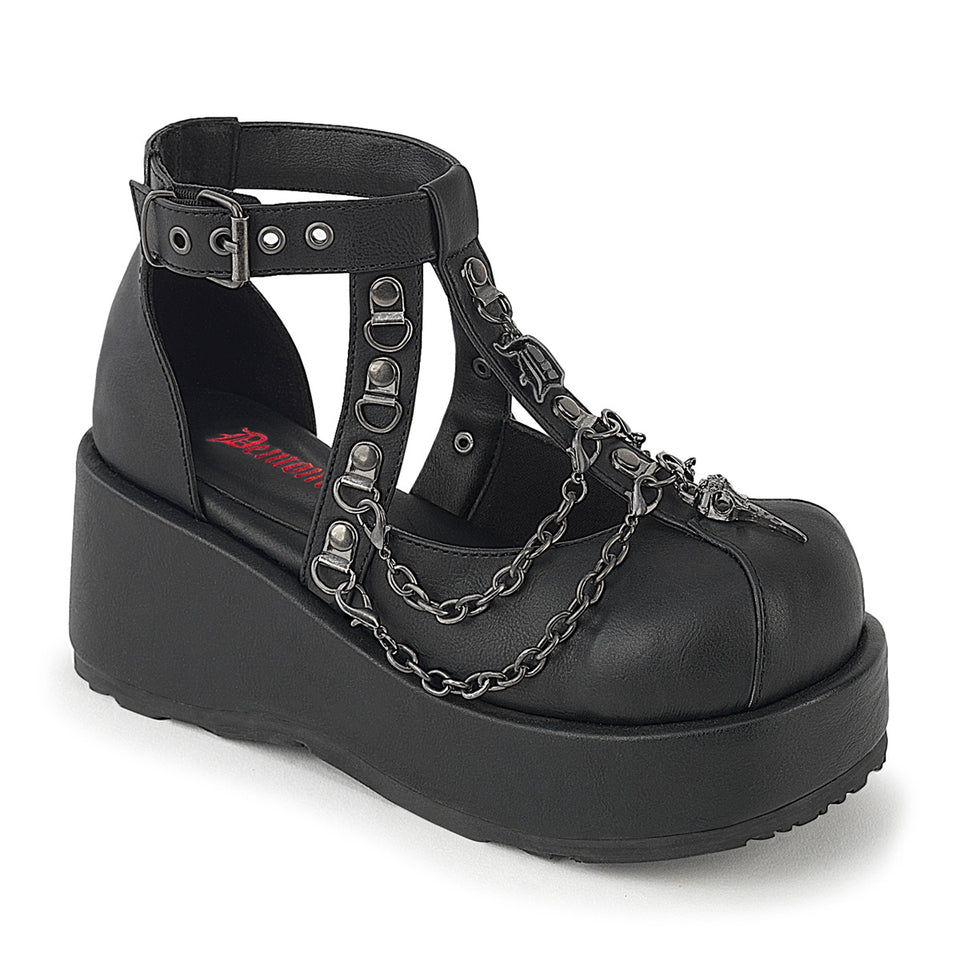 Step into the spotlight with the Cubby-28, a striking caged platform that blends gothic charm with sweetness. These black vegan leather beauties offer bold style without compromise. Secure your style with the snug strap and revel in the attention your dynamite look will attract. Embrace the edgy side of comfort and make your mark in the Cubby-28.
