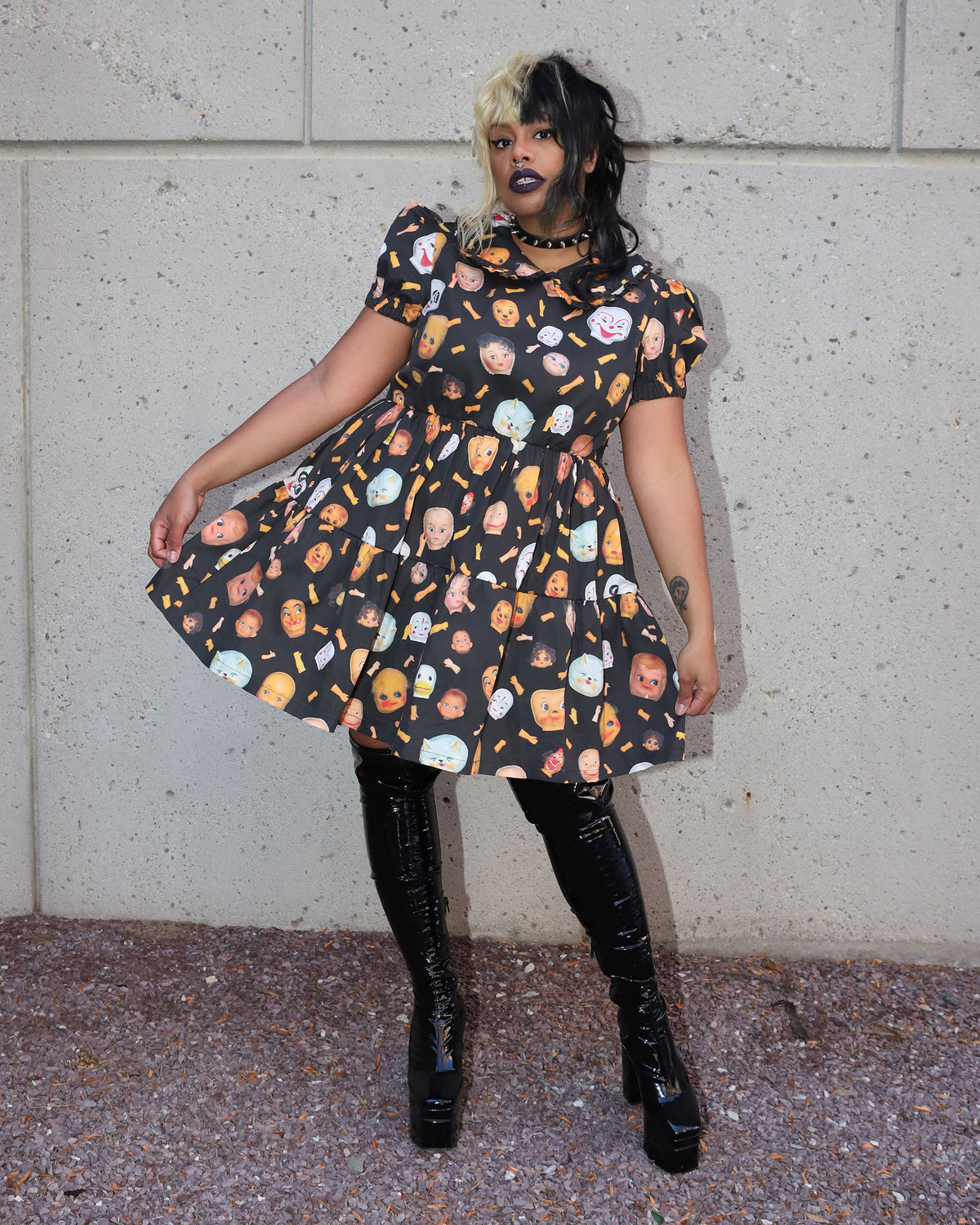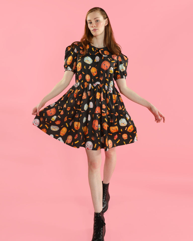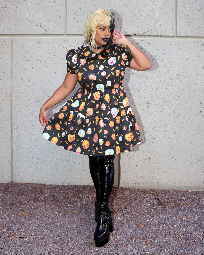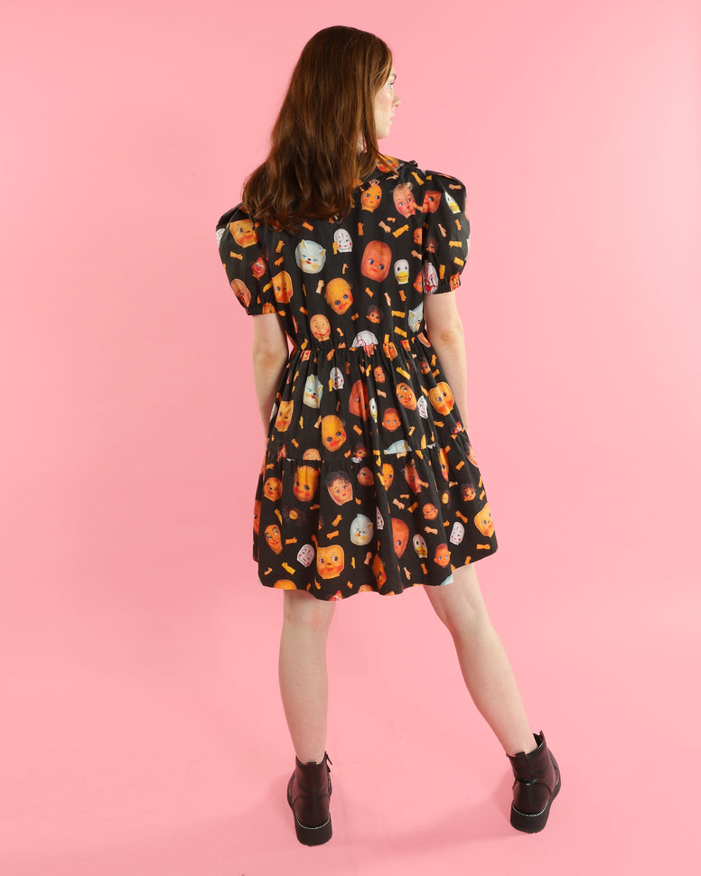 Babydoll dress covered in the famous Doll Parts print made from Joe's creepy doll part collection for Pretty Snake. This babydoll dress features a ruffled peter pan collar, puff sleeves, an elastic waist, and has side pockets! Designed to fit a little loose for a full doll experience.